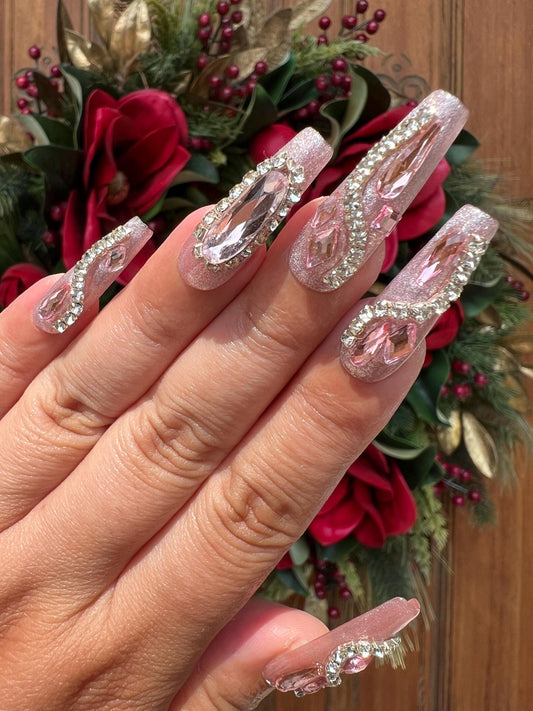 Pink Glitter Rhinestones Press-on Nail|Glue Nails|Nail Art|False Nails|Elegant Nails|Summer Sale|Fancy Event Nails|Trendy Nails